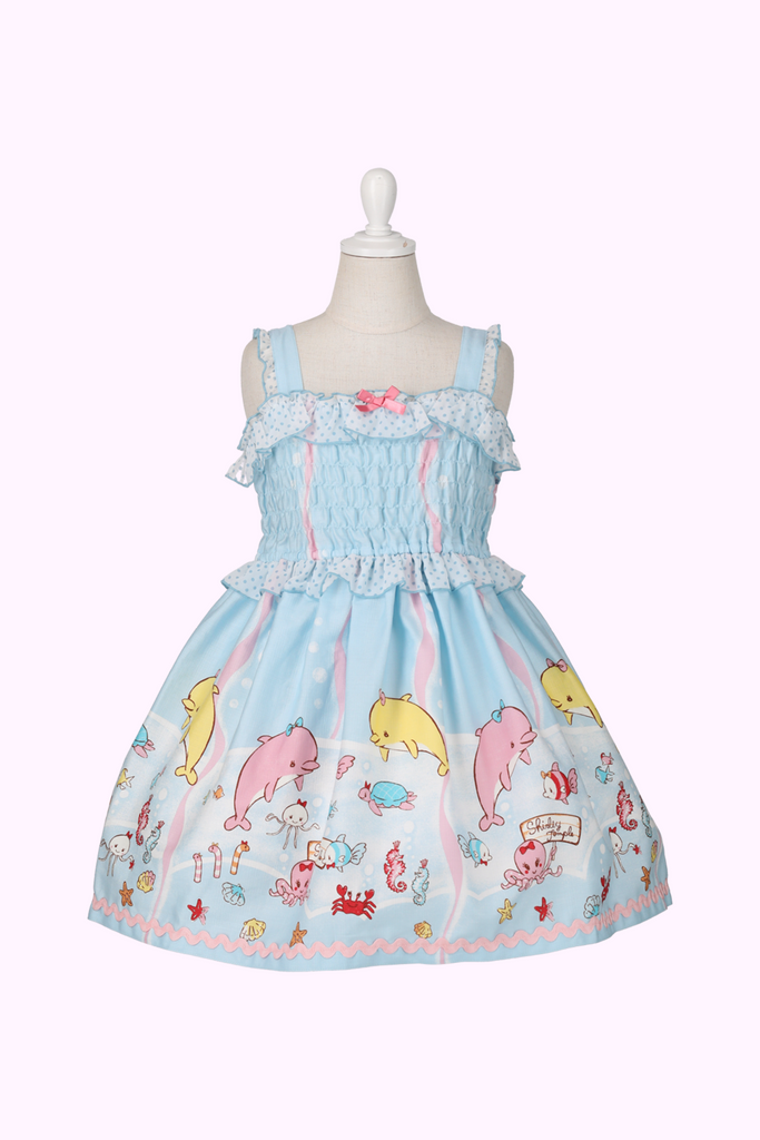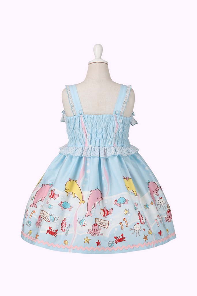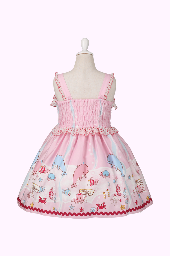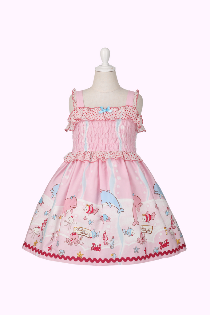肩ひものフリルや身頃にはシアードットフリルをあしらって、