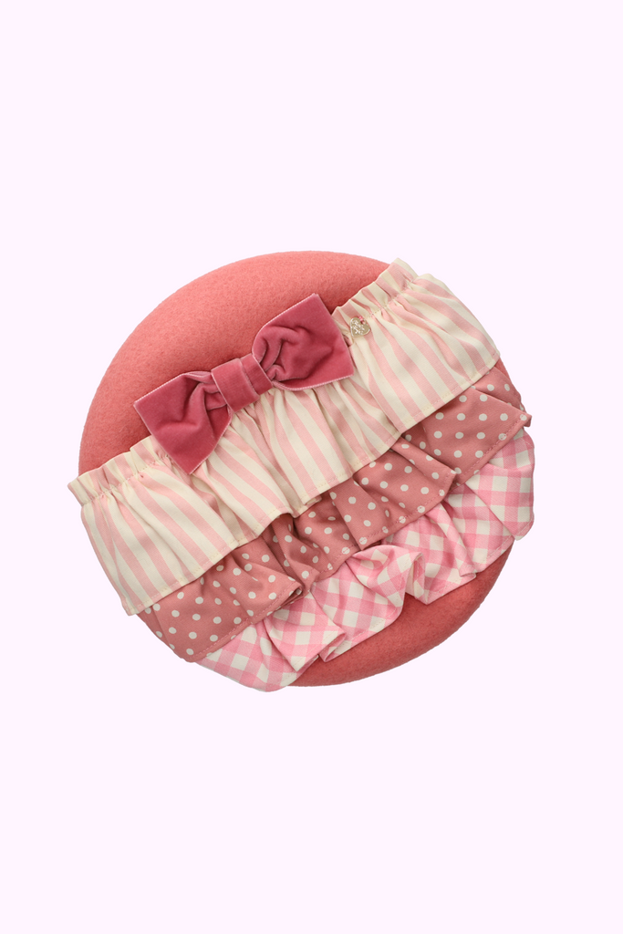 ギンガムチェックやドット、ストライプの生地をフリルが重なって、